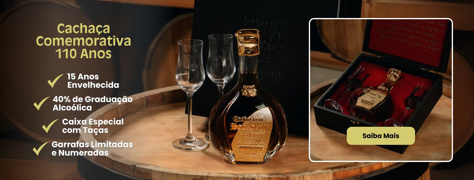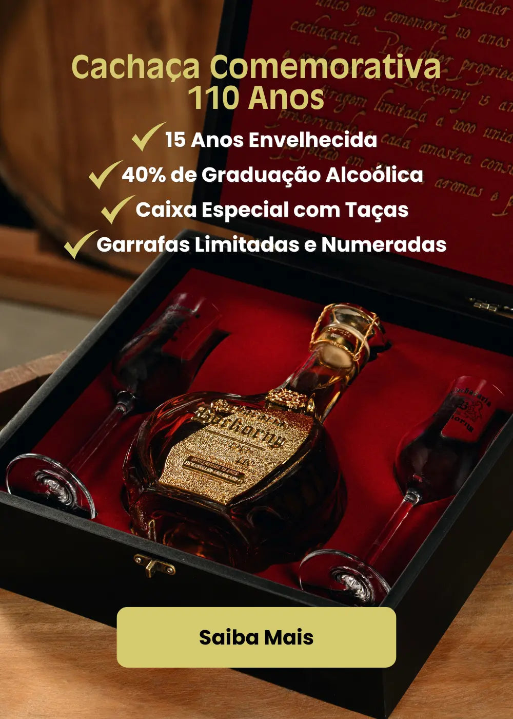 Descubra a perfeição em cada detalhe: uma cachaça extra premium, envelhecida 15 anos em carvalho americano, com notas sofisticadas de mel, baunilha e caramelo. Um tributo exclusivo à tradição e ao sabor. Clique em Saiba Mais e surpreenda-se!